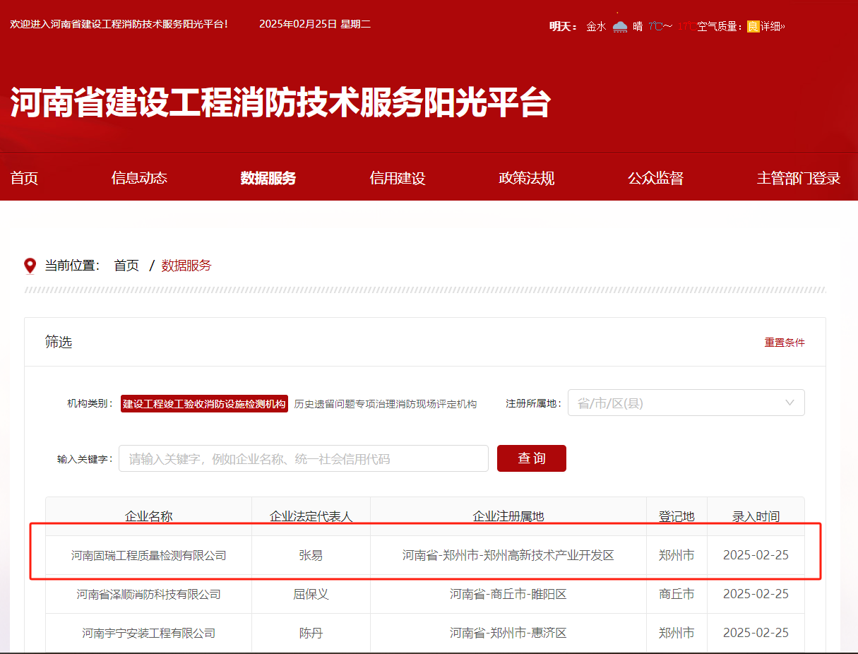 熱烈祝賀河南固瑞工程質(zhì)量檢測有限公司入冊河南省建設(shè)工程消防技術(shù)服務(wù)陽光平臺(tái)?。?!